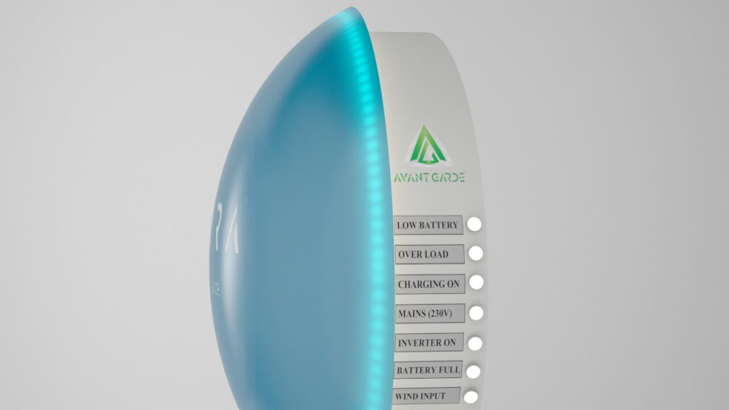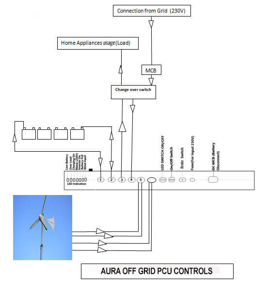 Functioning of AURA PCU: When batteries goes low output of the PCU will switch to Grid power and simultaneously the battery will start charging through Grid power for two/four hours (It has a manual selection switch for this). AURA PCU have the features of an Inverter, Wind Charger, Dump Load, Break Switch and Auto Voltage triggering device. All indications on AURA PCU are featured using LED lights which are for: Grid power, Battery normal, Low battery, Dump load ON, Inverter ON and Wind status.